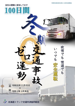| 令和元年度11月20日より冬期間の事故抑止に向けたキャンペーンを行います。組合員各社の「輸送の安全確保」に繋がる100日間冬期交通事故ゼロ運動を実施し、条件を達成された組合員には記念品を進呈いたします。 |